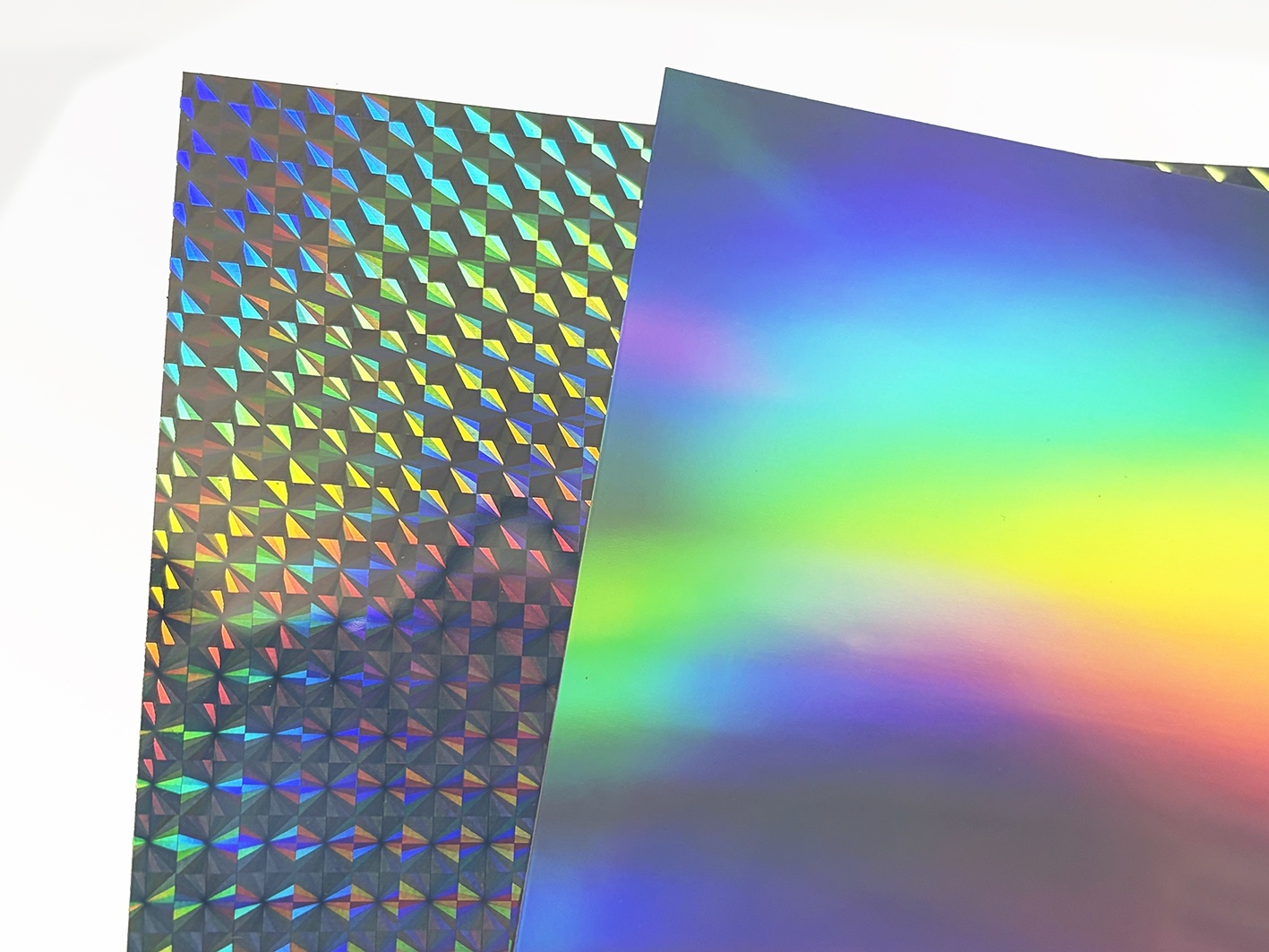 レーザー光線を利用した特殊な技術によって、立体画像やパターン(模様)を施したフィルムです。アルミ蒸着のフィルムにエンボス加工を施しているので、基本的にはシルバーのフィルムですが、光の角度によって虹色に輝きます。