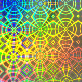 レーザー光線を利用した特殊な技術によって、立体画像やパターン(模様)を施したフィルムです。アルミ蒸着のフィルムにエンボス加工を施しているので、基本的にはシルバーのフィルムですが、光の角度によって虹色に輝きます。