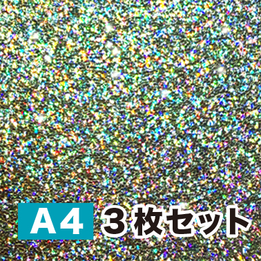 光を当てるとキラキラ輝くPP素材のグリッターフィルムです。こちらは A4サイズ(3枚セット)の販売ページになります。